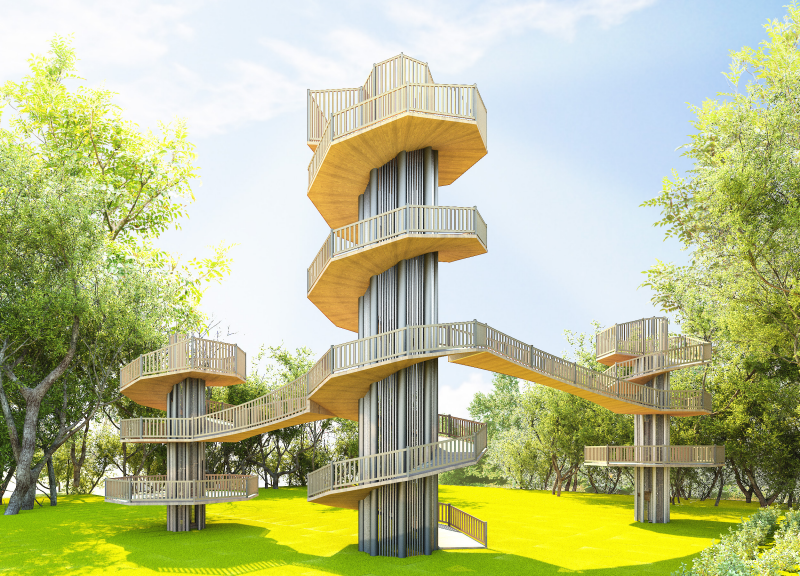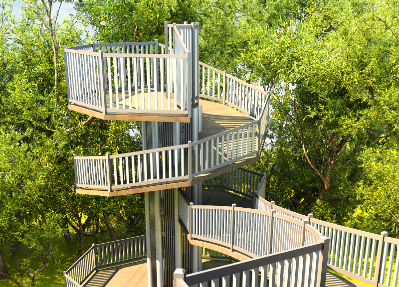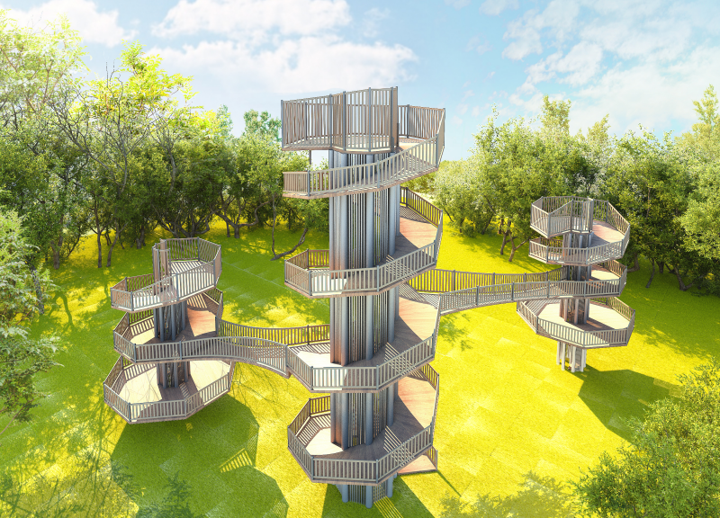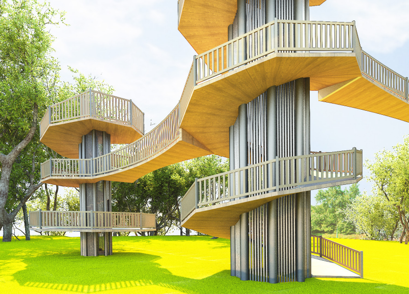 주변 경관을 조망할 수 있는 높이 있는 수직 전망대로 숲의 중 상부에 설치하여 주변 풍경과 시내 전경 등을 한눈에 볼 수 있는 시설물